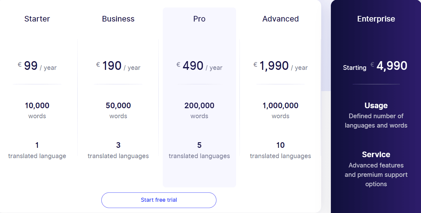 - Стартер: 9.90 евро в месяц за перевод на один язык до 10,000 XNUMX слов