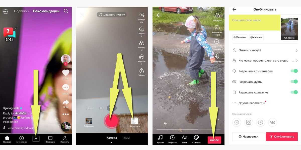 - зайдите в приложение и начните создавать новый ролик, нажав на плюс в нижнем меню;