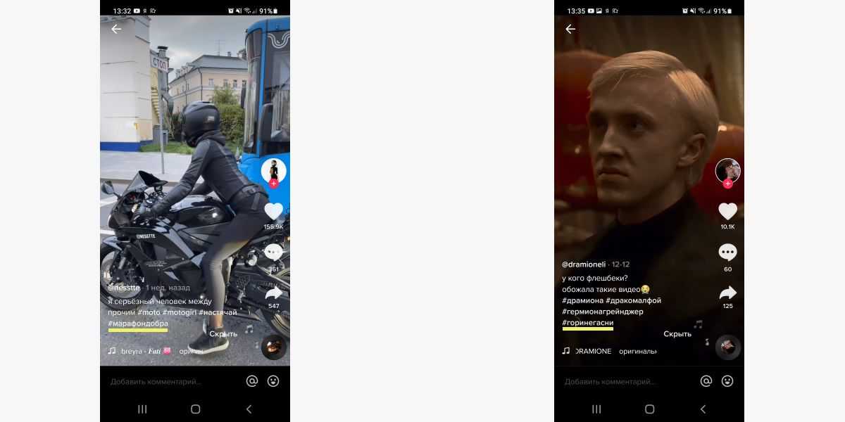 Листайте рекомендации, следите за трендами и применяйте эти приемы у себя. Только не переборщите с хештегами, пользуйтесь подходящими к вашему видео. Сделайте их простыми и запоминающимися. Система может отправить ролик в бан или ограничить просмотры, если хештеги не будут соответствовать содержанию ролика. Можно придумать свои хештеги, но помните о том, что они не скоро станут популярными и не начнут собирать большую аудиторию с первого видео.