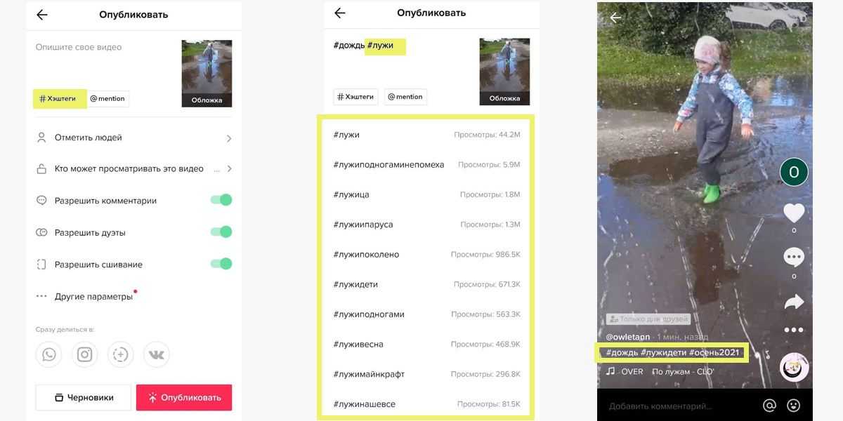 Как только вы напишете хештег, но не поставите пробел после, снизу вылетит список популярных тегов на это слово. Посмотрите их, возможно, некоторые подойдут к вашему видео. Когда закончите заполнять описание, опубликуйте видео.