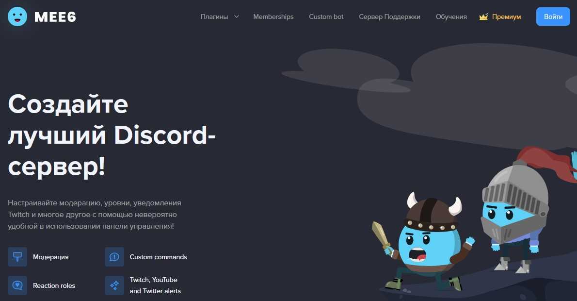 - Mee6 — полезный код в ситуации, когда вы только создали ваш сервер. Он существенно упростит и облегчит вашу жизнь на сервере, приветствуя игроков, уведомляя о стримах, отправляя с интервалами автоматические сообщения и многое другое.