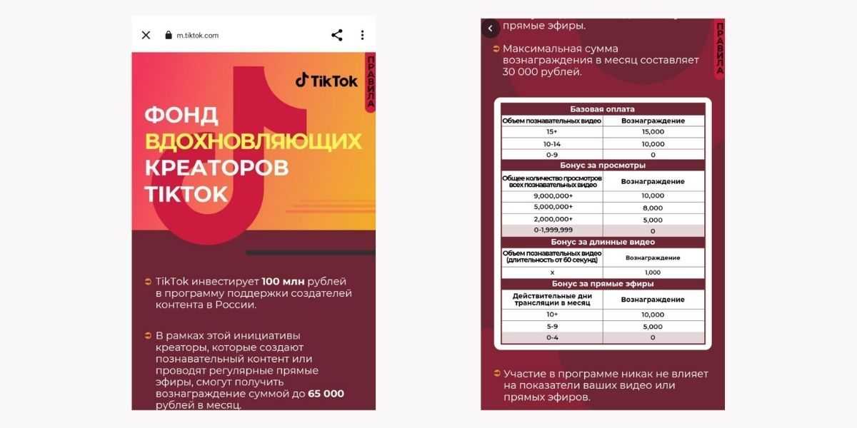 Хороший способ начать зарабатывать в ТикТоке для тех, кто снимает образовательный контент или любит проводить прямые эфиры. Фонд вдохновляющих креаторов – это официальная программа монетизации контента для российских авторов. Ее денежный фонд – 100 млн рублей.