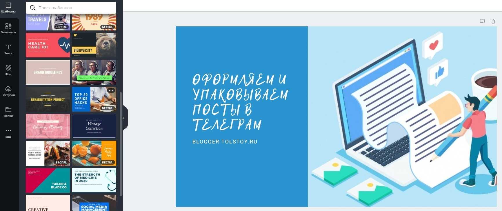 Чтобы создать красивые фото для своих постов в Телеграм не нужно никаких знаний photoshop. Достаточно использовать сервис Canva. На все потребуется 15-20 минут от силы. Покажу на примере создания превью для этой статьи.