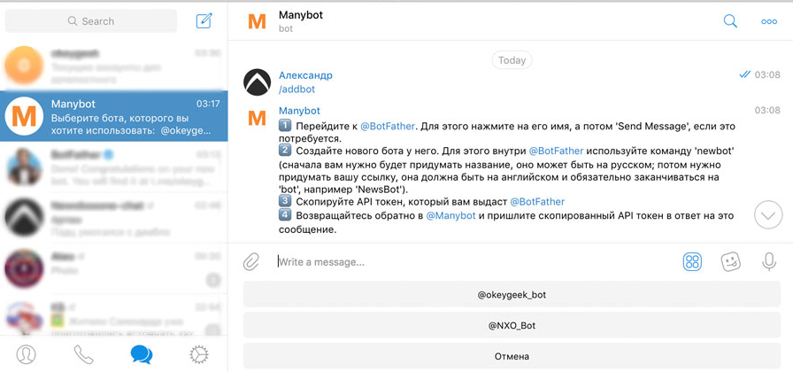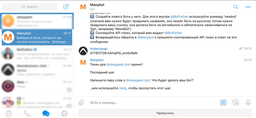- Скопированный токен введите в чат с @manybot.После чего он должен проверить и принять его.