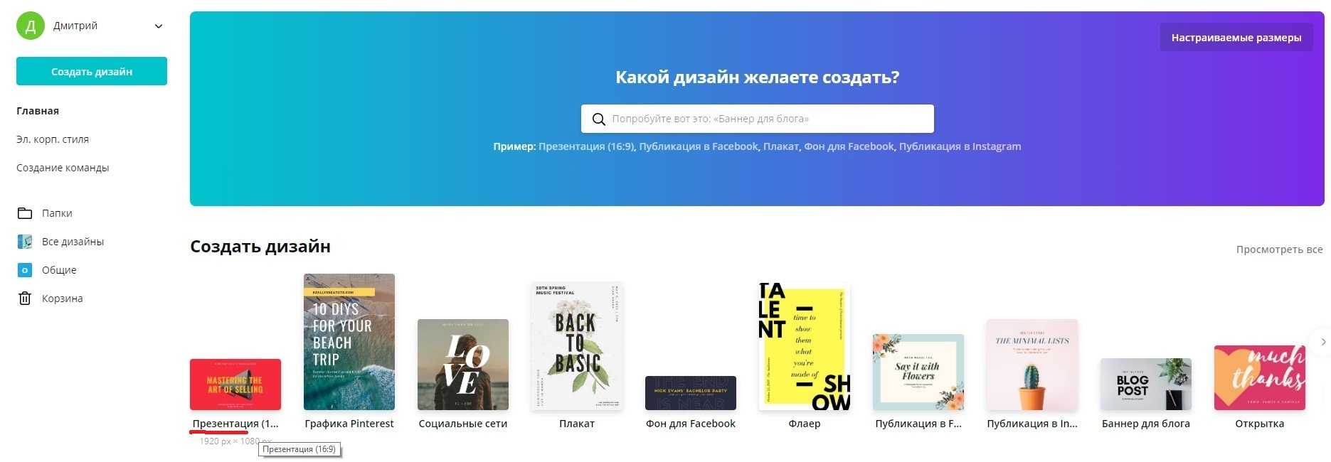 1. Иду в Canva и выбираю тип презентация 16:9 (подойдут и другие горизонтальные форматы).
