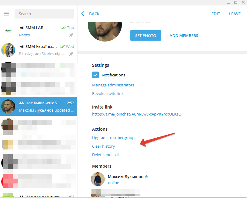Шаг 10. Также здесь есть функции: обновить до Супергруппы, очистить историю чата, удалить и выйти из чата.