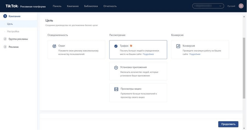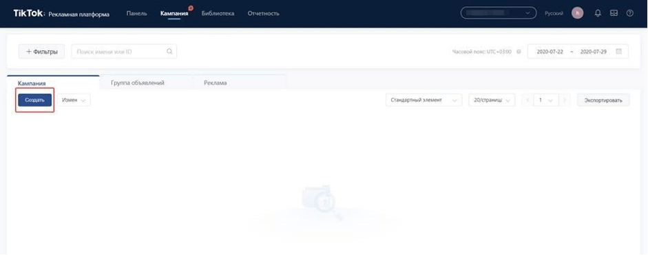 После этого подготовительного этапа реклама в Тик-Ток перейдем к тому, как создать рекламную компанию. Нажмите на вкладку “Кампании” в шапке страницы и кликните “Создать”.