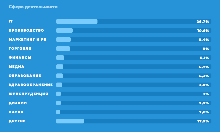 В Telegram представлена преимущественно взрослая, образованная и работающая аудитория из крупных городов. Так выглядит сегментация пользователей по сферам работы.