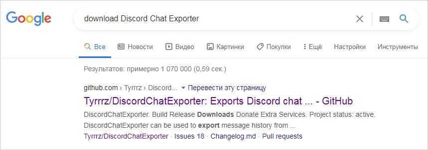 Чтобы начать загрузку (экспорт) чата из канала и истории сообщений, перейдите на страницу GitHub и скачайте Discord Chat Exporter. Для этого сделайте запрос в интернете по имени этого приложения и после отображения результатов поиска перейдите на сайт, указанный на рисунке.