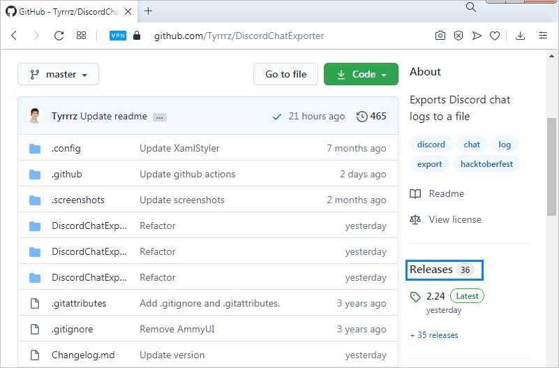 Перейдите на вкладку Releases и загрузите последнюю версию DiscordChatExporter.