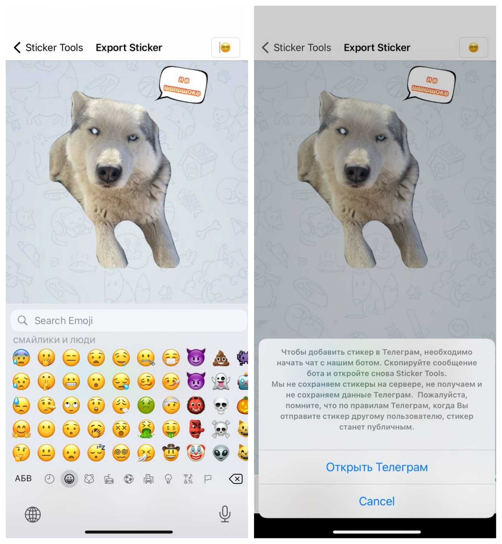 Отправка ссылки на набор стикеров — не единственный способ поделиться им. Когда вы получаете стикер из набора, не установленного у вас, необходимо просто нажать на него и выбрать «Добавить в стикеры» («Info» на iOS) для просмотра и добавления всего набора.