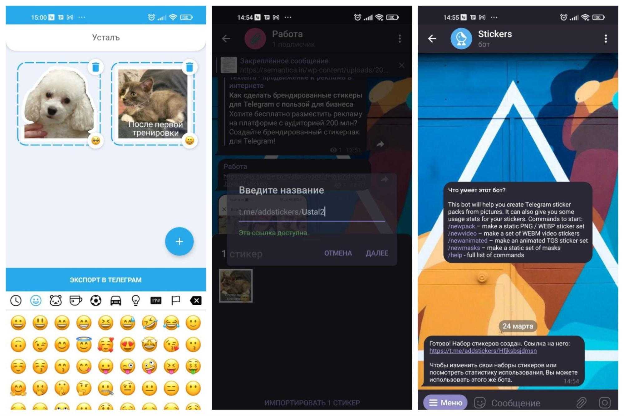 Кроме этого пользователи могут создать собственные стикеры в Телеграм. В Телеграме есть специальный бот под названием «@Stickers». Чтобы добавить собственный пак, нужно ему написать команду «/newpack» и придумать название. Далее отправлять смайлик, который соответствует будущим изображениям. После этого можно загрузить сам png файл.