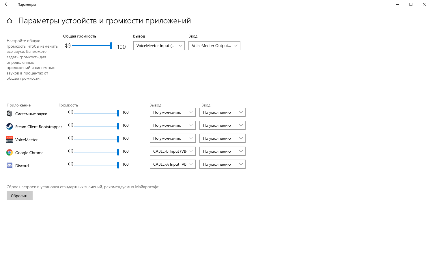 Например, для Google Chrome можно выбрать устройство «CABLE-B Input (VB-Audio Cable B)», а для Discord «CABLE-A Input (VB-Audio Cable A)».