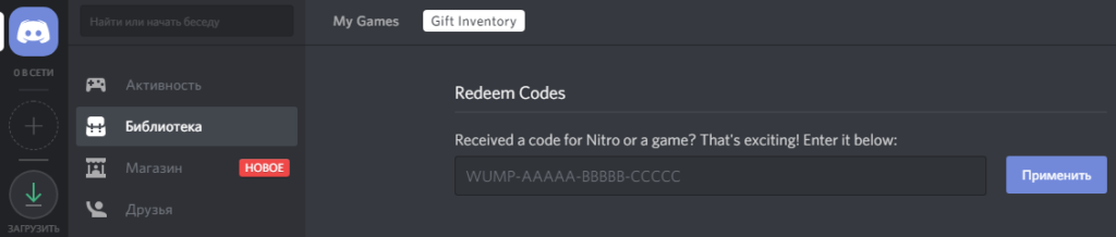 Так, в канун Рождества 2019 участники HypeSquad получили поздравительное письмо, в котором были Дискорд коды на Нитро. Если ввести такой код в разделе Gift Inventory своей библиотеки (доступна из главного меню мессенджера) и активировать подарок, вы получите бесплатный месяц.