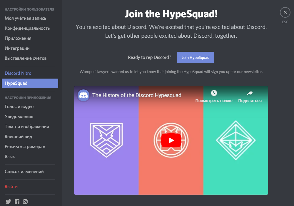 Есть еще один официальный способ, как получить Дискорд Нитро бесплатно на месяц – при помощи HypeSquad. Это специальная команда поддержки мессенджера, попасть в которую можно через другой раздел настроек.