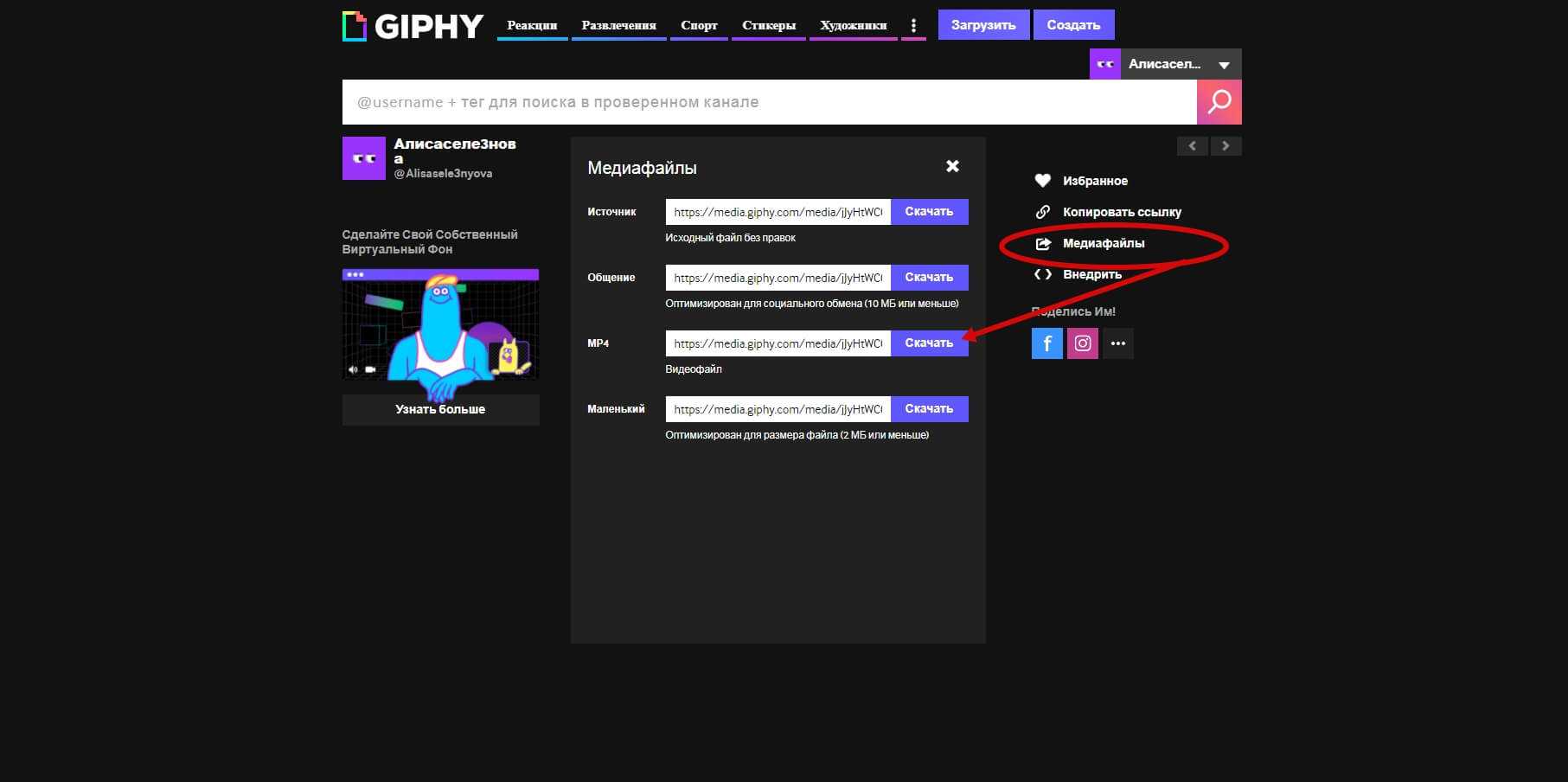 Нажмите в правом меню «Медиафайлы» и сохраните MP4-файл на компьютер