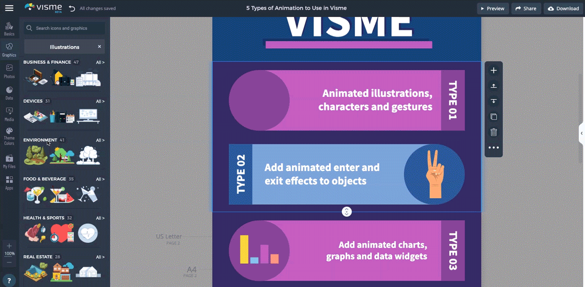 В проекты, созданные в Visme, можно добавить различные анимированные элементы,