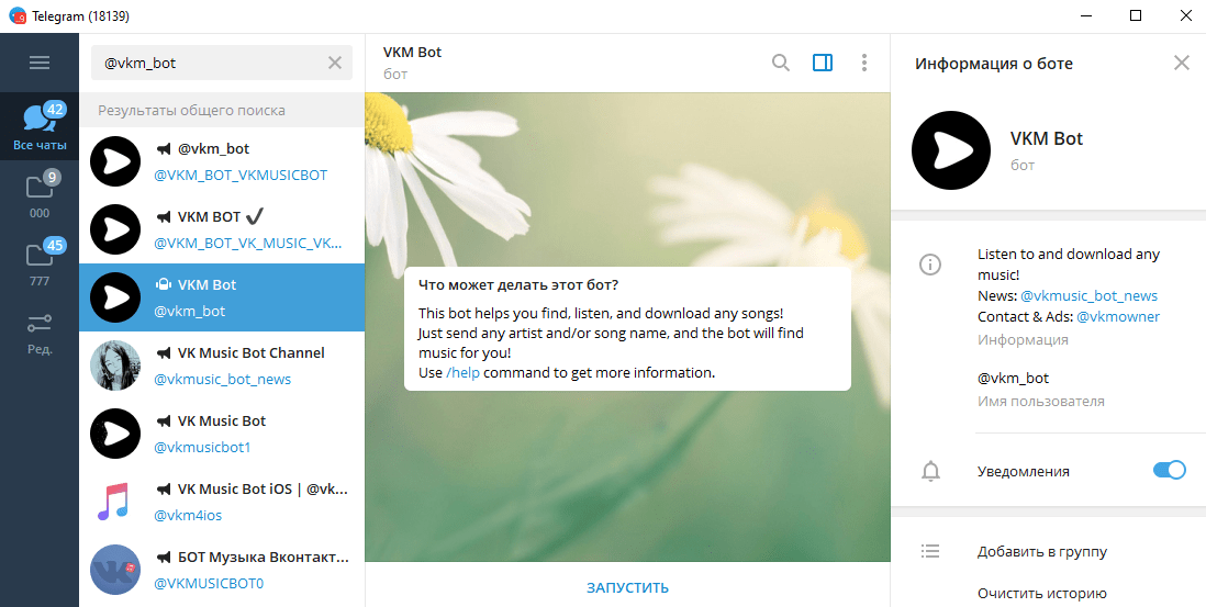 - В поиске каналов находим @vkm4bot, запускаем;
