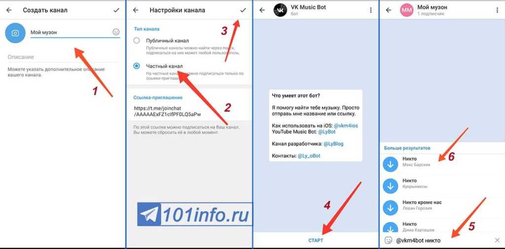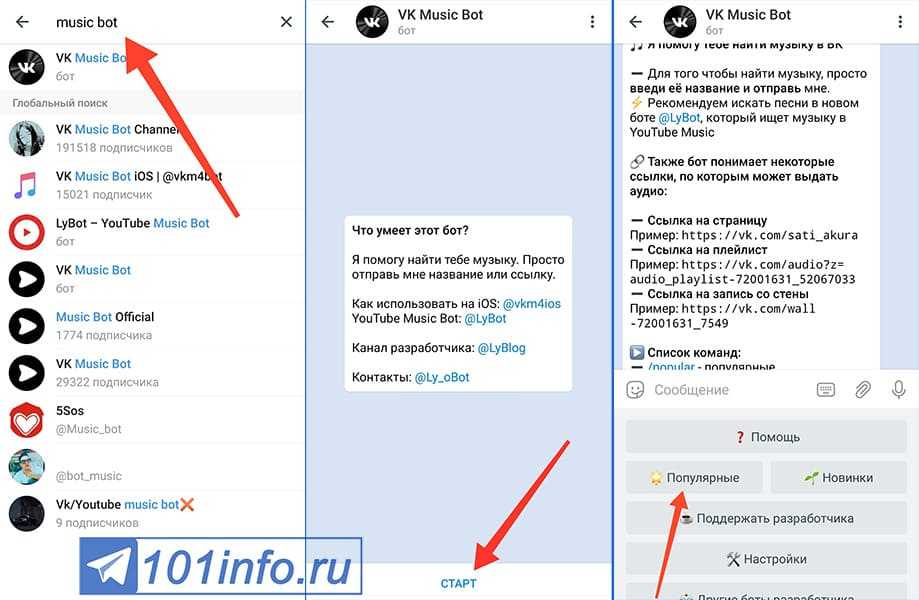 Наиболее простой способ прослушивания музыки – с использованием бесплатных ботов. Для этого в поиске достаточно ввести ник, начинающийся с символа «@». У каждого бота своя инструкция по использованию, но чаще всего нужно нажать на кнопку «Старт» и ввести название интересующей композиции. К выбору пользователя будут доступны несколько треков с похожими названиями — оригиналы и ремиксы. Рассмотрим несколько наиболее известных ботов: