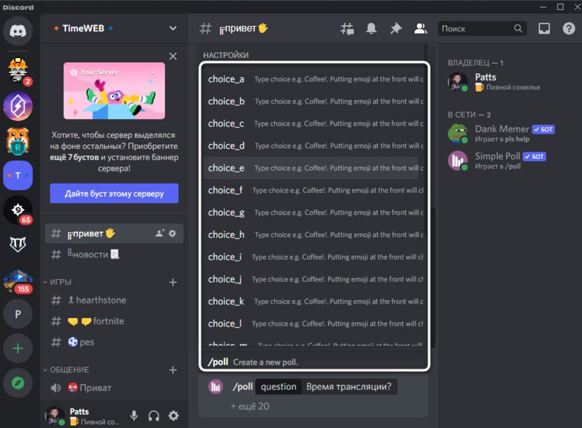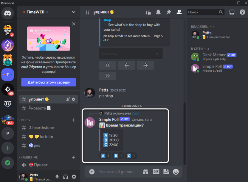 Выбор бота, в функциональность которого входит функция создания голосования, зависит исключительно от вас. Возможно, на вашем сервере уже установлен бот для администрирования, который позволяет создавать опросы. Я возьму за пример Simple Poll, поскольку в нем есть только одна команда с необходимыми настройками, чего вполне достаточно для выполнения поставленной задачи.