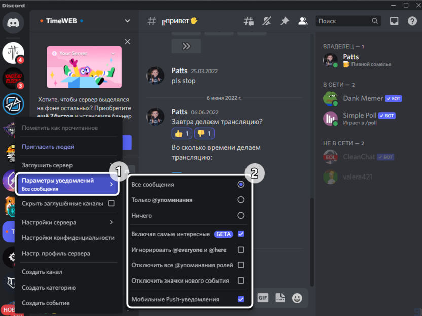 Отключение уведомлений на определенных серверах