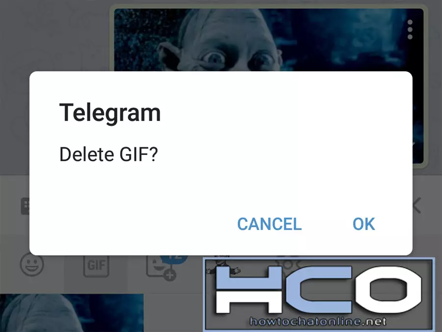 - Tap OK to remove GIF. Telegram will ask your to “Delete GIF?”. Tap OK to remove GIF from Telegram.