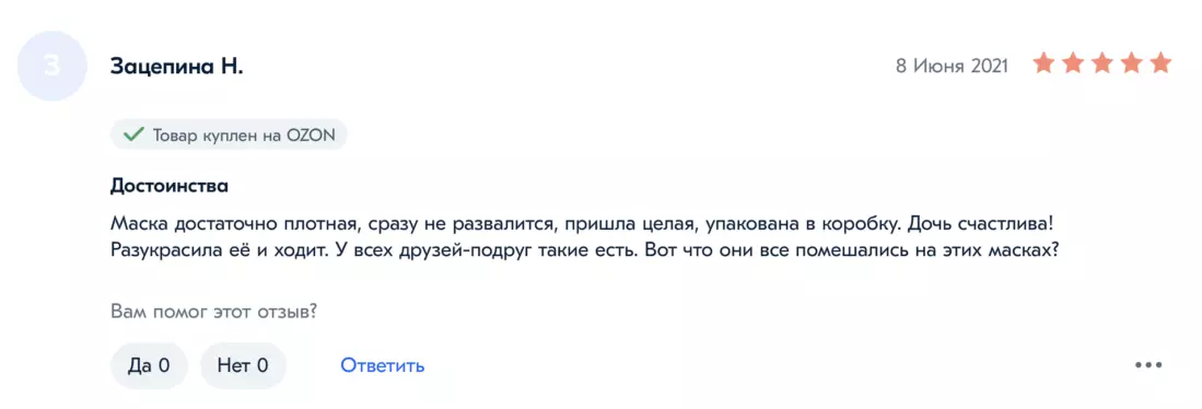 Судя по предложениям и отзывам на маркетплейсах, включая Ozon, Wildberries, «Яндекс.Маркет» и Aliexpress, спрос на маски действительно вырос. Чаще всего отзывы оставляют родители, которые заказывают маски своим детям.