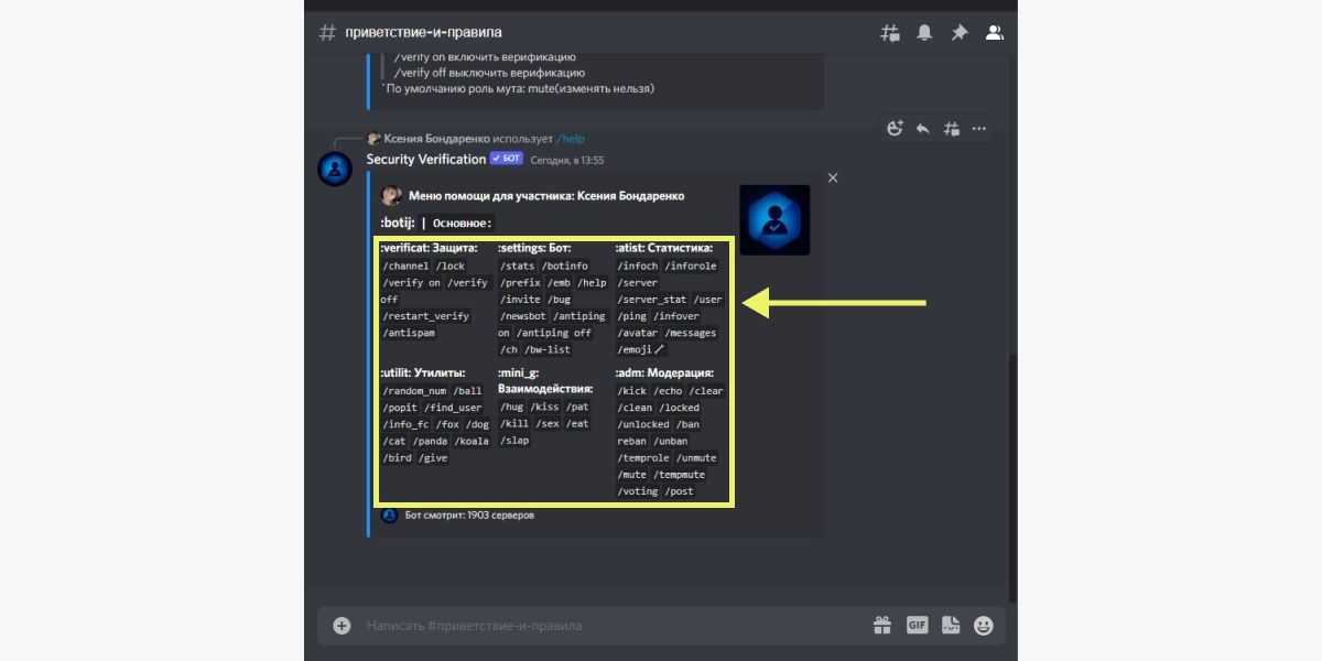 - Информационные. Информация о пользователе, сервере, показывает эмодзи, доступные на сервере, информацию о каналах;