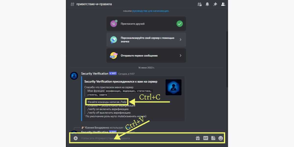 Возвращаетесь в Discord. Находясь в только что созданном чате, в строке ввода сообщения, нужно указать команду m!play затем пробел и скопированная ссылка (Ctrl+V). Нажимаете Enter на клавиатуре для отправки. В чате должно отобразиться ваше сообщение.