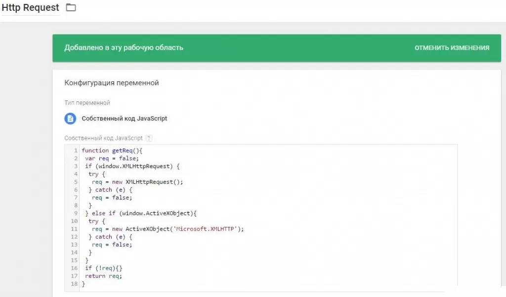 Для этого следует действовать так же, как и при создании первой переменной. Но название должно быть другим (в примере вторую переменную назвали «Код ответа сервера»). Вставляется такой JavaScript-код: