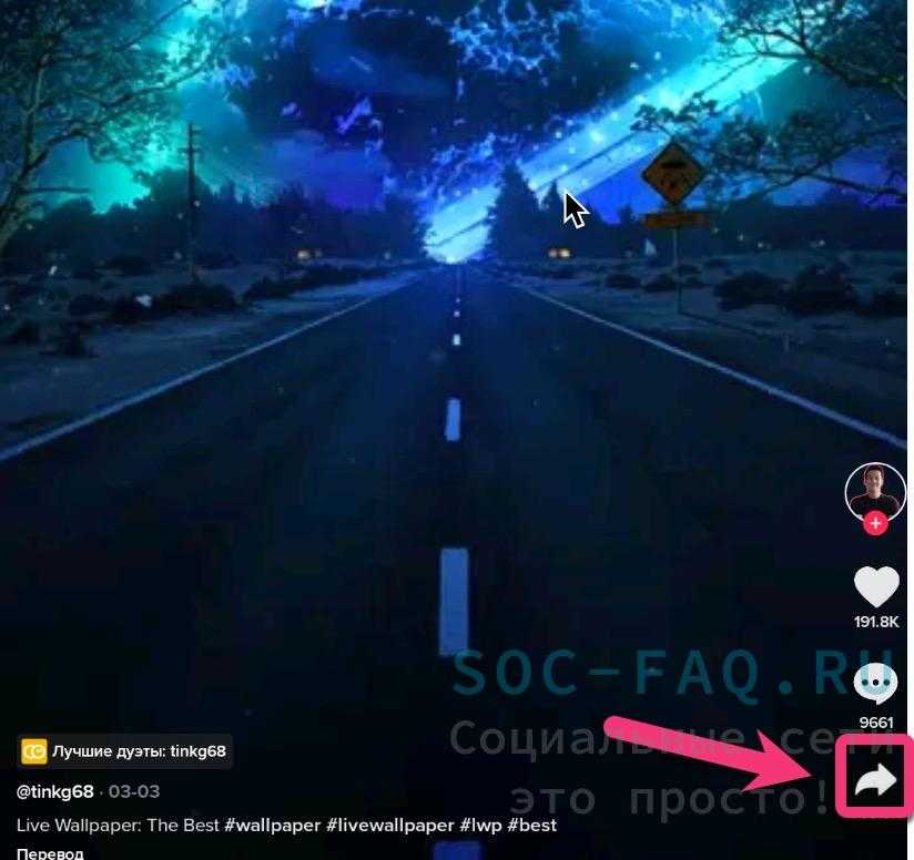 Найти понравившееся видео, нажать на кнопку «Поделится».