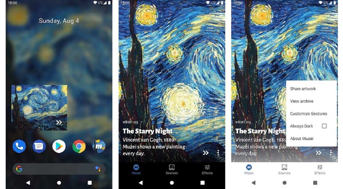 Muzei — это приложение с движущимися обоями для Android, которое ежедневно обновляет ваш экран блокировки, добавляя различные изображения. Тоже автоматически менять обои каждые несколько часов на основе изображений, отмеченных пользователем как избранные.