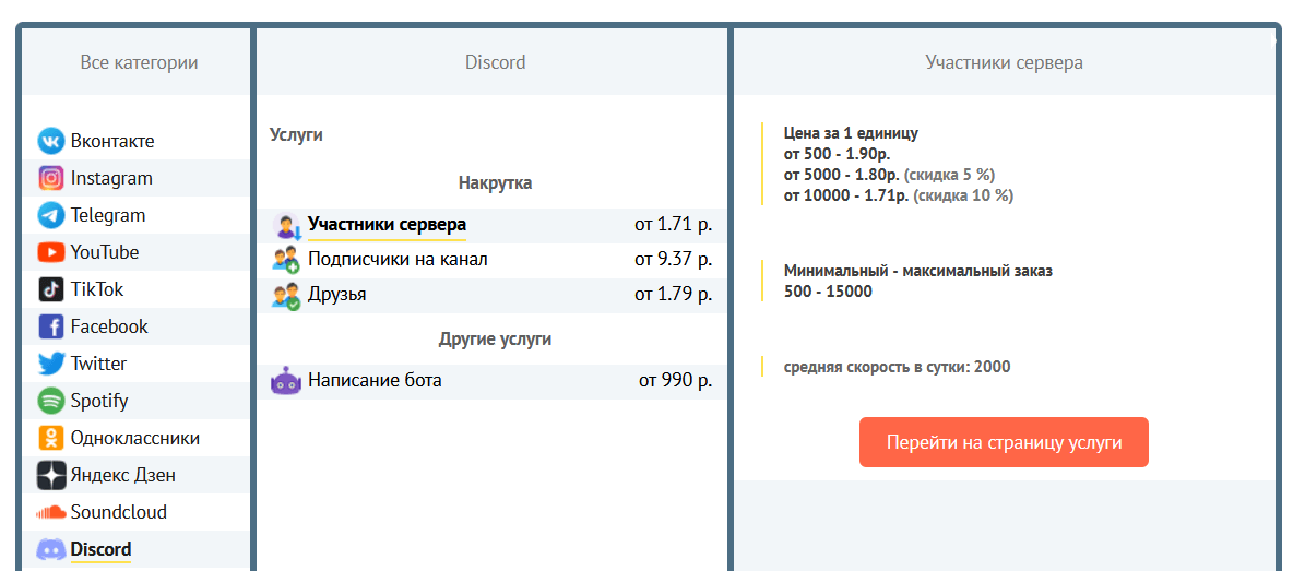 Эта площадка предлагает накрутить подписчиков на канал, друзей и участников сервера. Последних можно купить в количестве не менее 500 шт. Платформа добавляет пользователей с разной скоростью, в зависимости от раскрученности сервера и количества в нем людей.