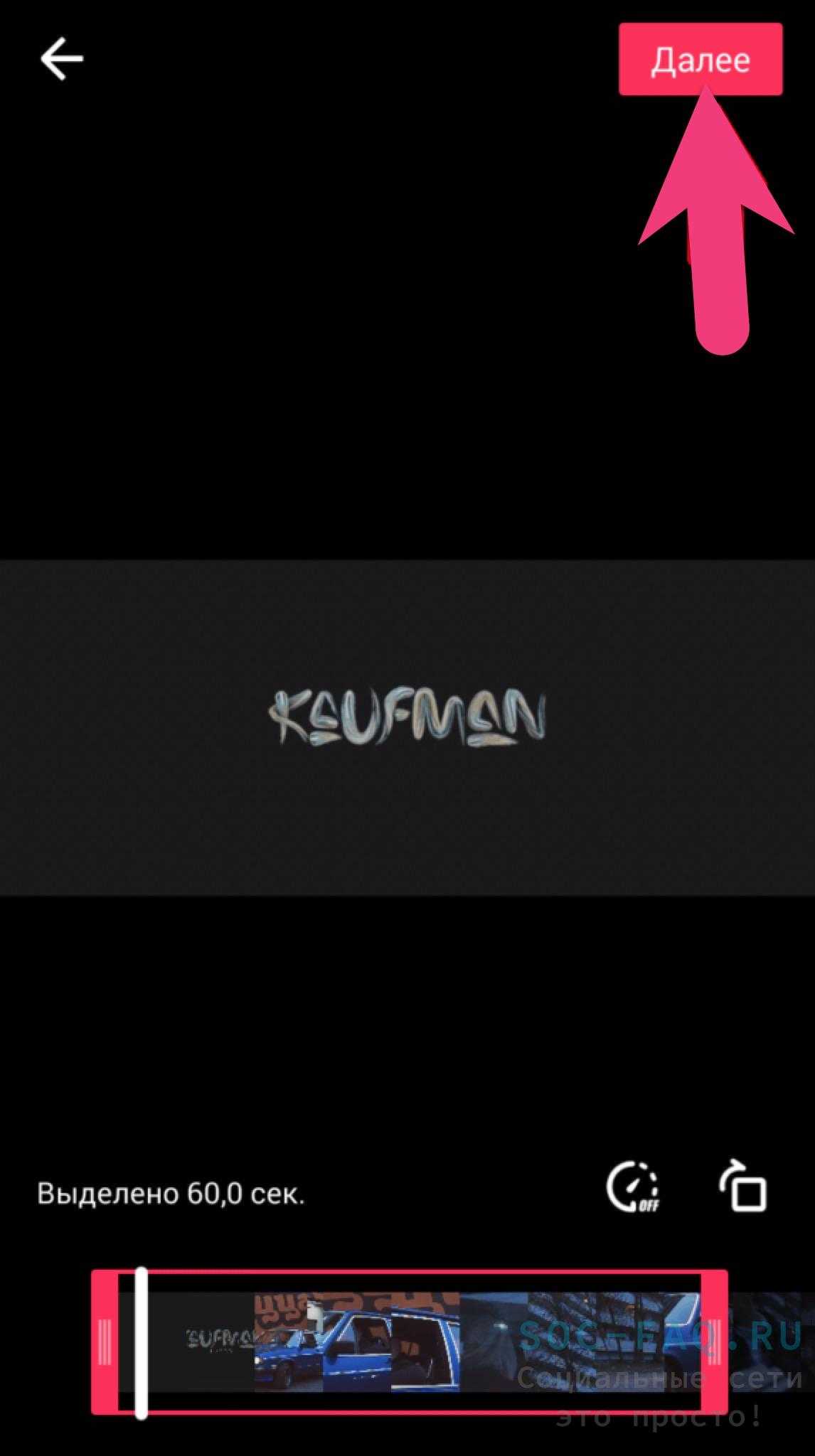 Переходим в галерею и выбираем видеоОбрежьте ролики до нужной длины, если они будут выходить за пределы установленных площадкой ограничений, обрезка произойдет автоматически. Замедлите или ускорьте видео, используя ускоритель под кнопкой записи.
