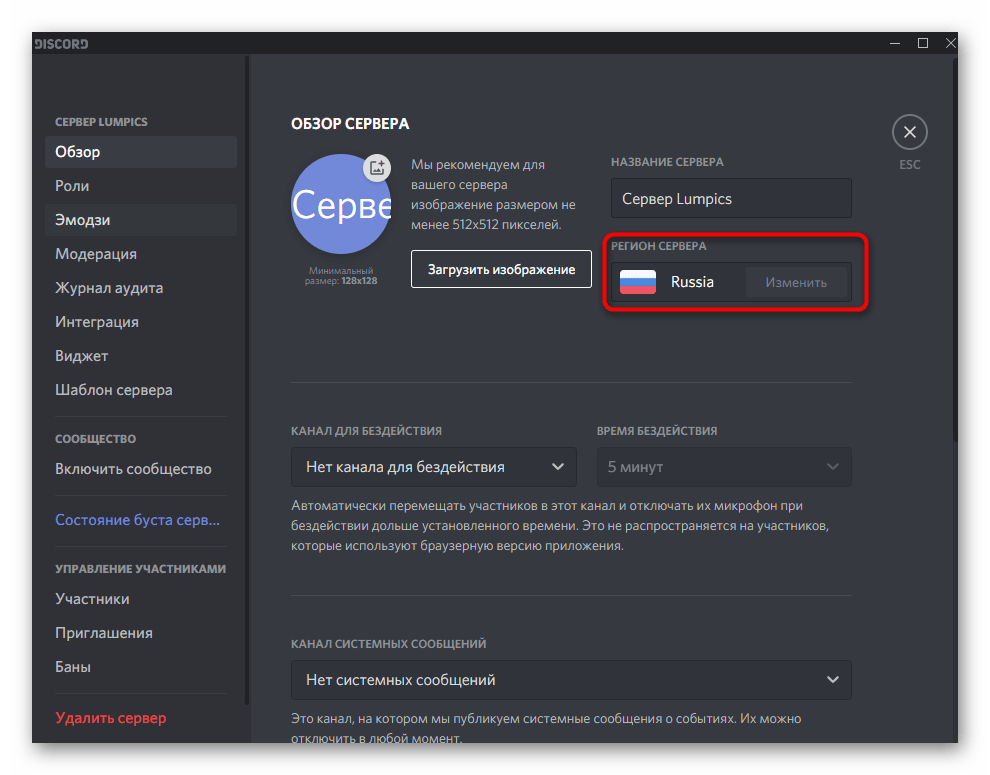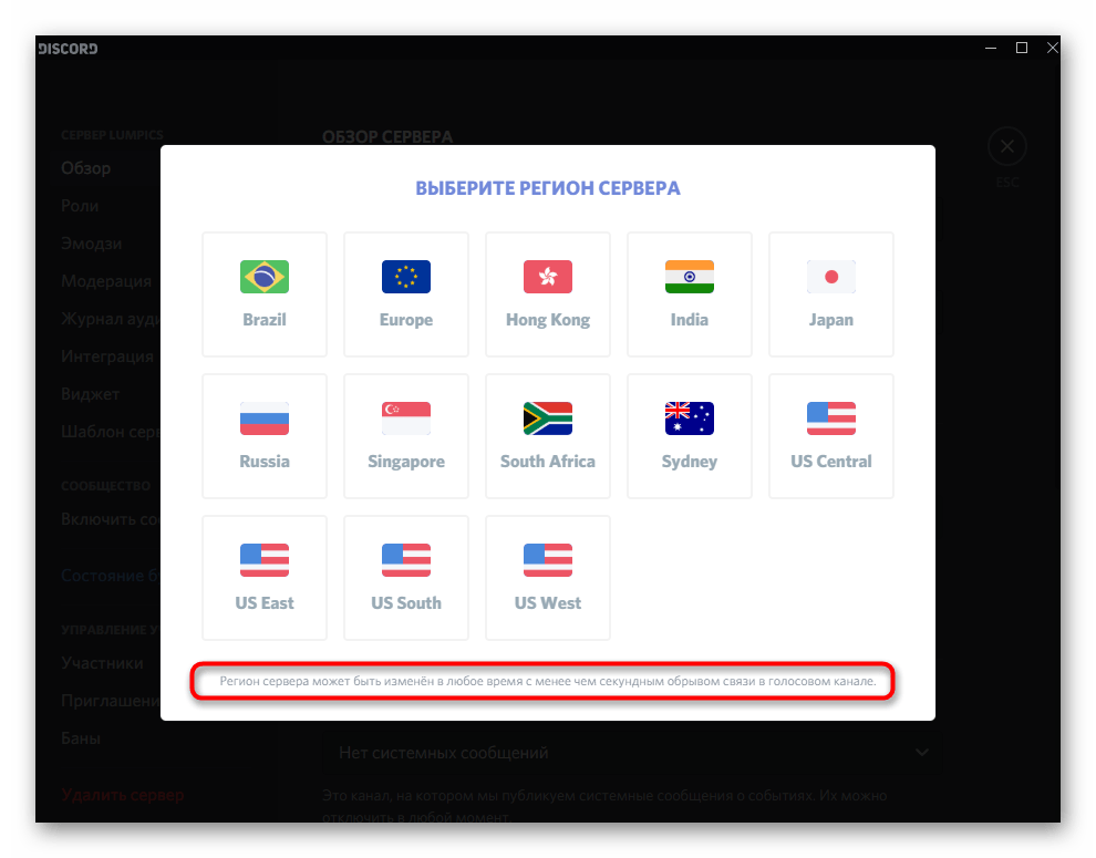 Если вы являетесь создателем или администратором сервера и вам поступила коллективная жалоба о том, что возникли неполадки на голосовых каналах, скорее всего, достаточно сменить только регион сервера, чтобы произошло переподключение на другие, более свободные каналы связи. Для этого у вас должен быть доступ к общим настройкам сервера.
