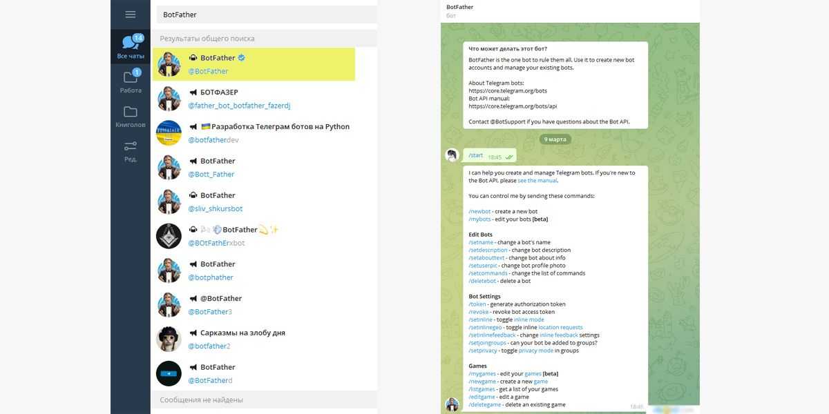 Рождение каждого бота происходит при помощи @BotFather. Нужно скопировать этот адрес в поисковую строку мессенджера и из возможных вариантов выбрать тот, что соответствует названию. В открывшемся окне диалога нажать на кнопку «старт» и начать процесс создания или редактирования.