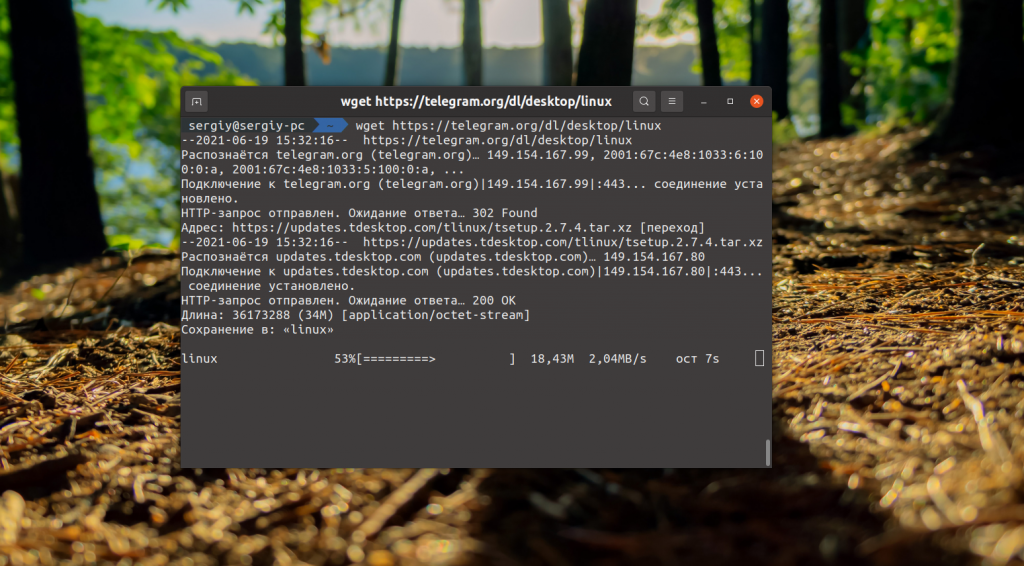 Еще один способ установить Telegram в Ubuntu 18.04 – это использование подготовленного бинарного файла из официального сайта. Для его загрузки введите команду: