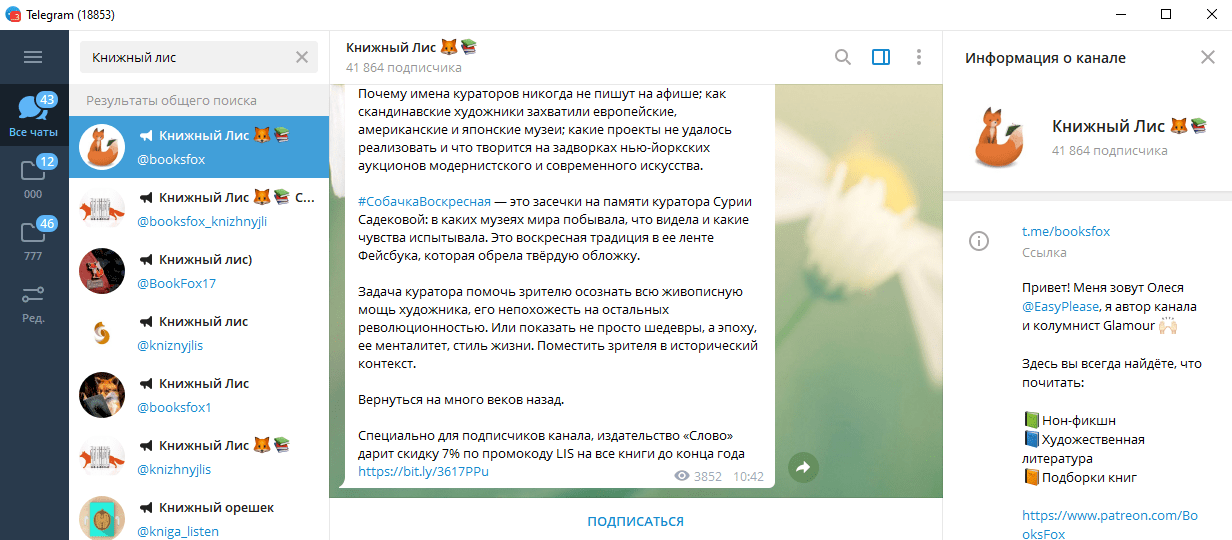 «Книжный лис» – это ресурс с уютной домашней атмосферой. В общедоступном блоке написано: «О любимых книгах, комиксах, поэзии». Каналом пользуется больше 40 тысяч человек, отмечается постоянный рост аудитории. Доступны документы на русском и других языках. Администраторы постоянно предлагают различные конкурсы и дополнительные бонусы для пользователей.