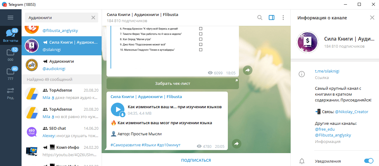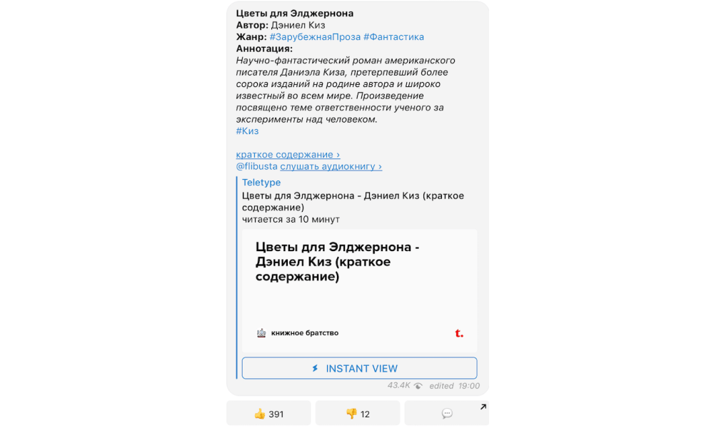 Один из самых известных и старых ресурсов для скачивания книг в ру-вебе. Здесь ежедневно публикуются самые известные книги и их краткое описание от сервиса Брифли – для тех, кто не хочет тратить время, чтобы прочесть книгу полностью. Довольно неплохой вариант. Для тех же кто хочет прочитать книгу полностью, но опять же, не хочет тратить время – можно послушать аудиокнигу. Причем аудиокнига тоже расположена внутри Телеграма, разбита на несколько десятков глав и опубликована в Телеге. Удобно. Я прочитал краткое описание книги “Цветы для Элджернона”, вполне сносное краткое описание, можно использовать, чтобы быть слыть эрудированным, хотя полное погружение в книгу и в суть не получится.