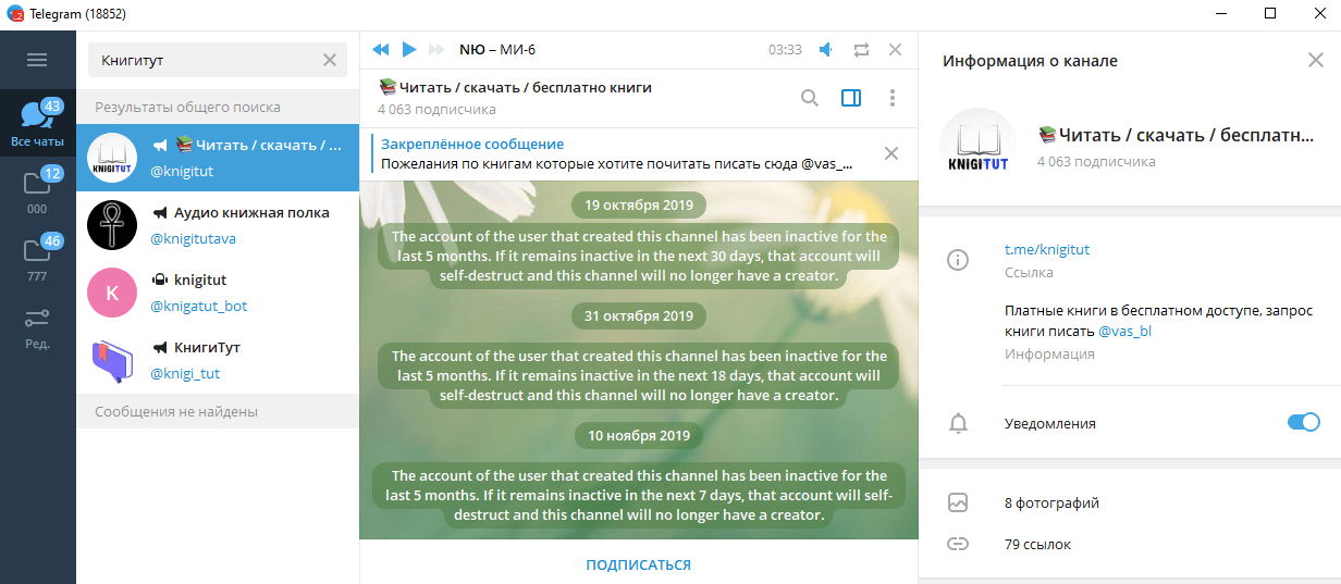 В отличие от предыдущего канала, Audioknigi_Channel имеет большую базу аудиокниг, но ее едва хватает для поиска каких-то редких копий. К достоинствам можно отнести подробную аннотацию к каждой работе и две функции: «Слушать» и «Читать».