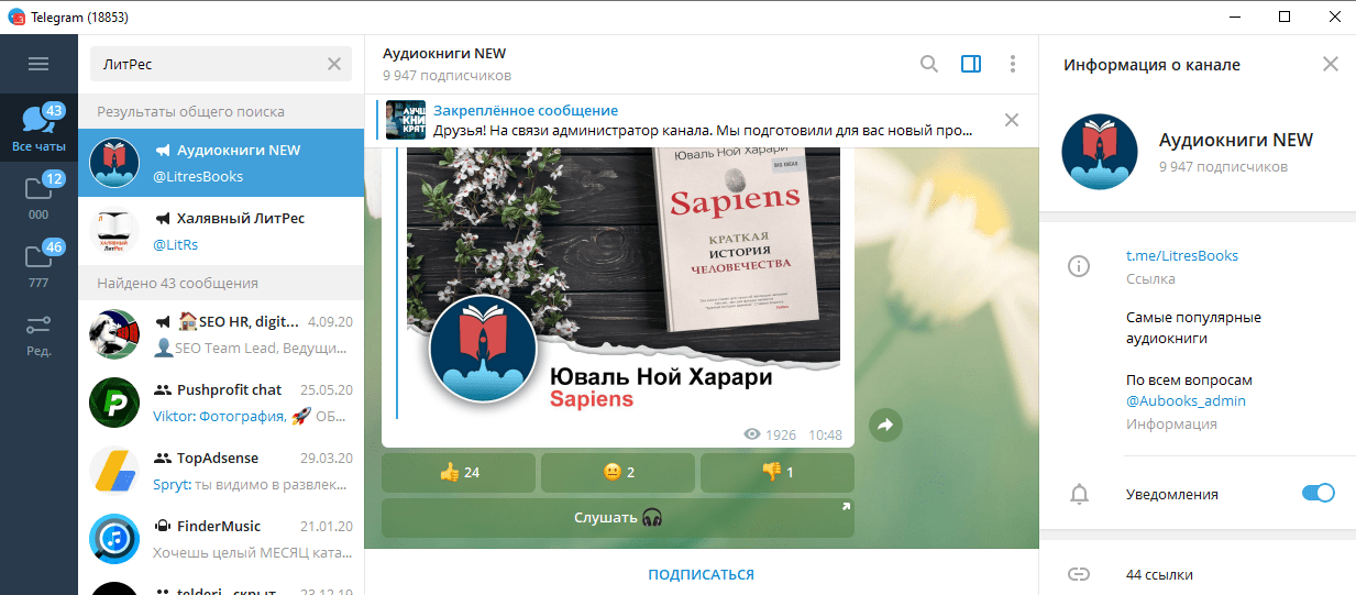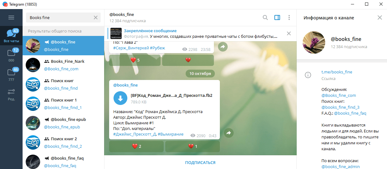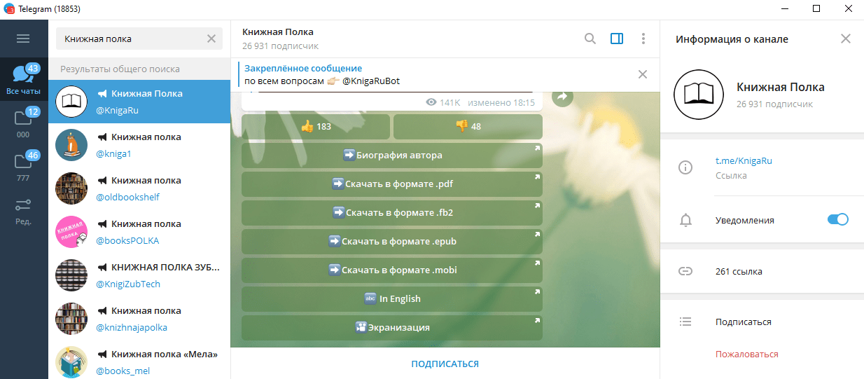 Как отмечалось ранее, в Telegram есть не только боты для поиска литературных произведений, но и каналы, посвященные этой теме. Конечно, использовать их на порядок сложнее, так как потребуется много усилий, чтобы найти нужную копию, и не факт, что автор канала добавил книгу, которую вы ищете, в коллекцию.