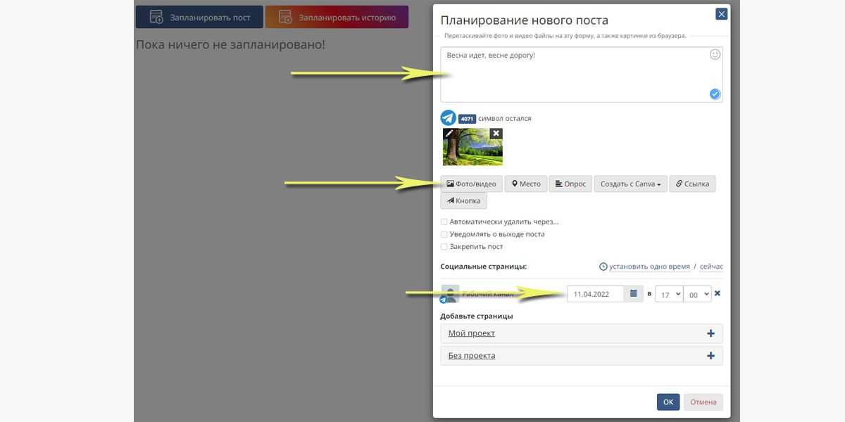 Действуйте так же, как и при планировании постов в другие соцсети: введите текст, выберите визуал, ваш канал в мессенджере, и установите дату и время выхода поста