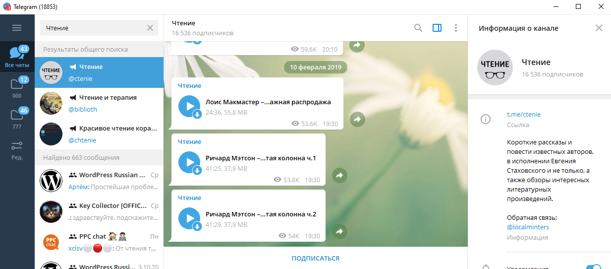 «Чтение» – это канал с мини-произведениями от популярных авторов, записанных в аудиоформате. Скачивать не нужно, доступно прослушивание в мессенджере. Источником пользуются больше 15 тысяч пользователей. Иногда ресурс «замирает», однако посты сохраняются и доступны в любой момент.