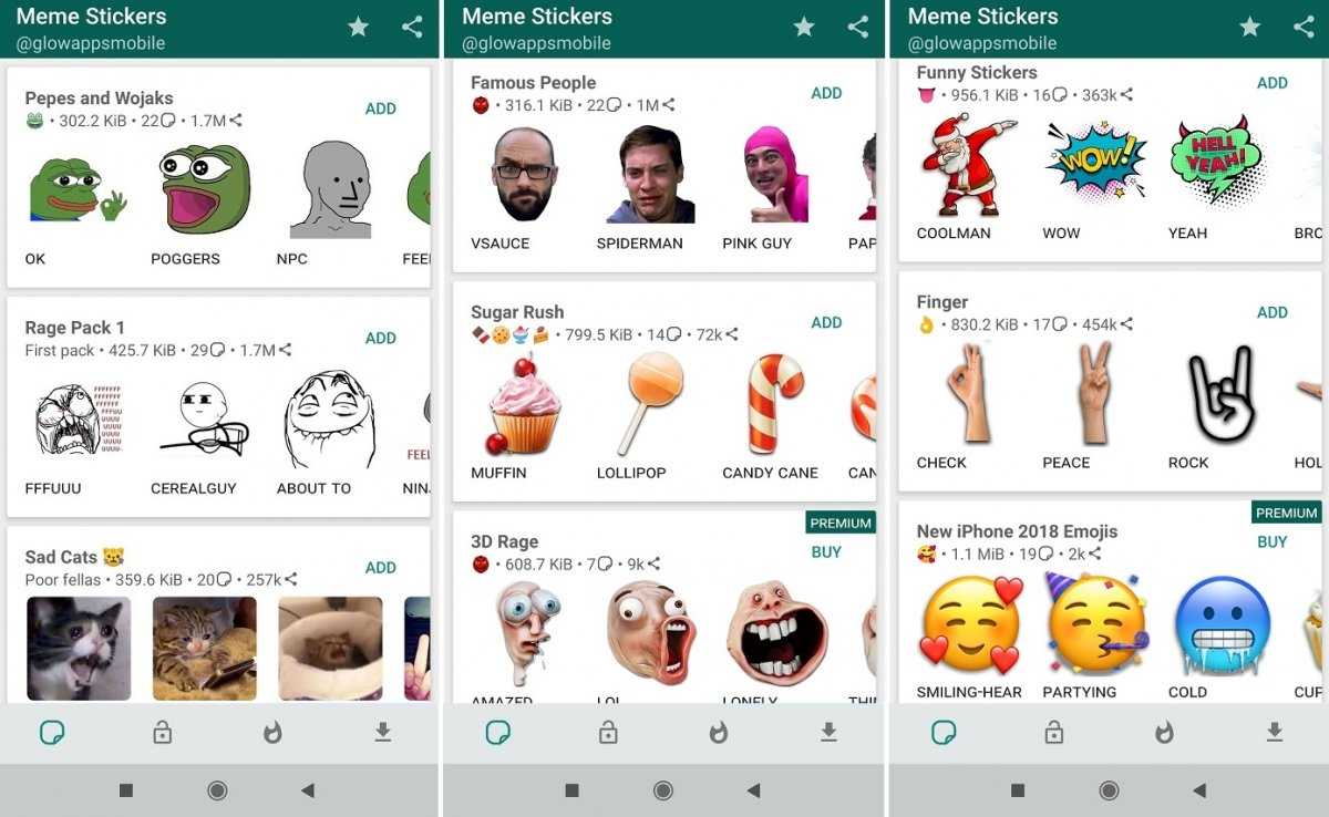 Некоторые говорят, что мемы — лучшее, что дал нам Интернет, и, наверняка, они правы. По этой причине этот набор стикеров очень важен, поскольку он содержит практически все, от классического forever alone или rage guy до самых современных, включая мемы знаменитостей, таких как Чак Норрис, Дональд Трамп или Илон Маск. Конечно, не все бесплатны, для некоторых из них требуется премиум-подписка.