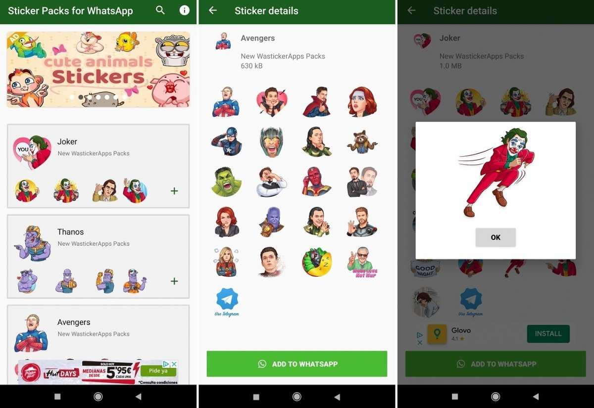 Если мы увлекаемся комиксами и супергероями, и у нас есть друзья «не от мира сего», которые оценят фейспалм Бэтмена в качестве ответа, это приложение не может отсутствовать на вашем мобильном телефоне. В нем можно найти стикеры с изображением Капитана Америки, Джокера, Таноса, Мстителей, Дэдпула и разных персонажей из комиксов DC. Нужно просто нажать + в наборе, который мы хотим добавить, смотреть небольшой рекламный ролик и начать использовать их.