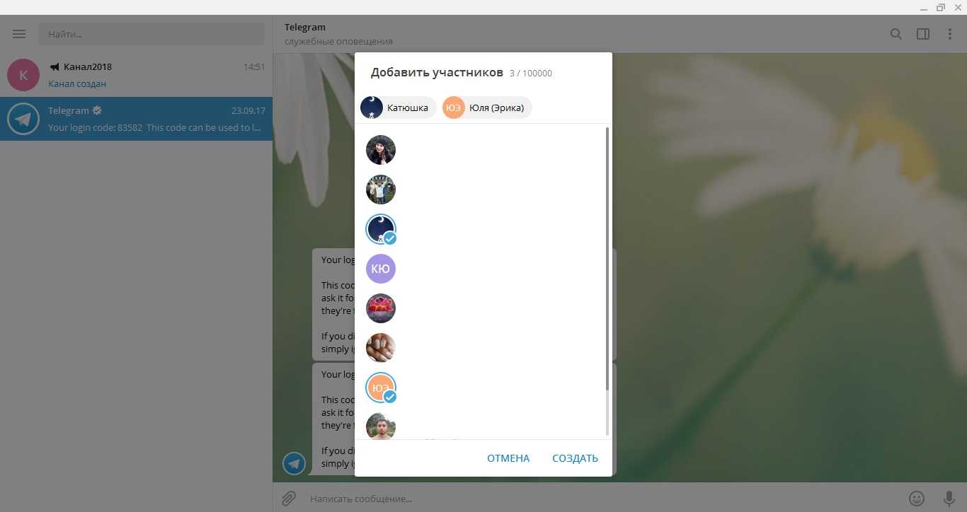 Для выбора участника достаточно кликнуть на пользователя, и он появится в верхней части окна.