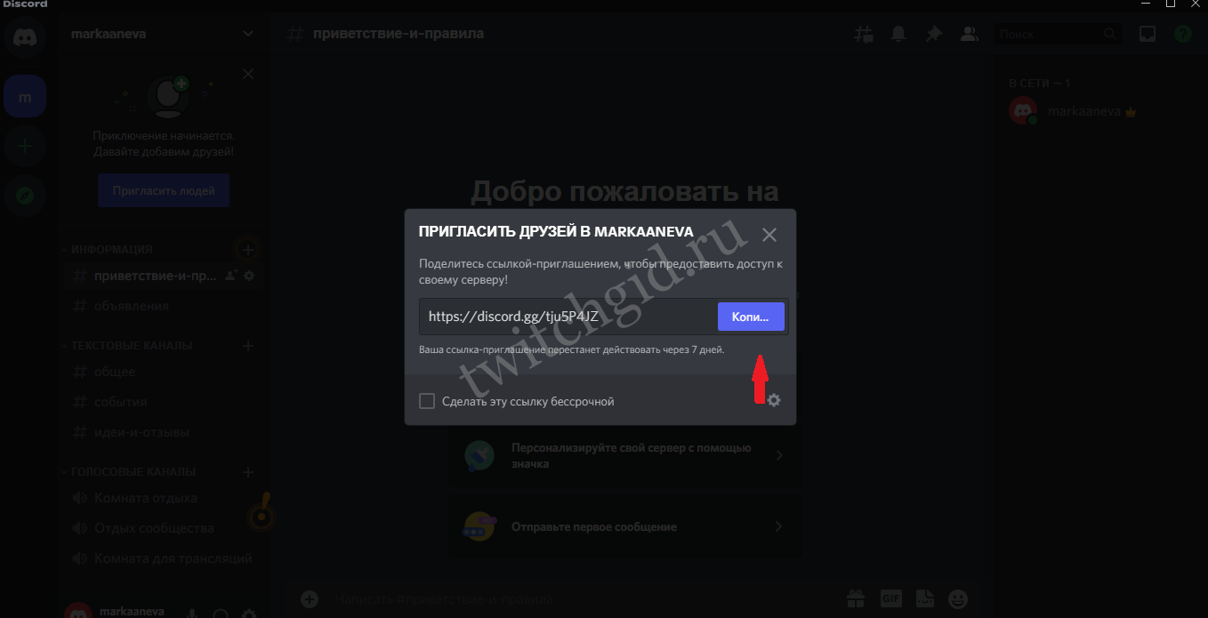 Приглашение такого вида действует семь дней, но вы можете нажать на галочку «Сделать бессрочным», чтобы не думать о том, как добавить на сервер в Дискорде всех интересующихся людей. Позже вы можете удалить созданное приглашение через одноименный раздел настроек.