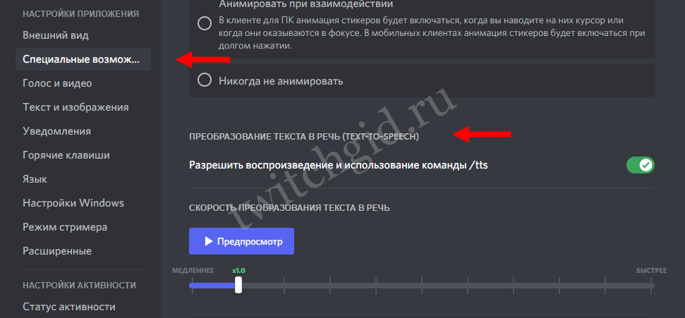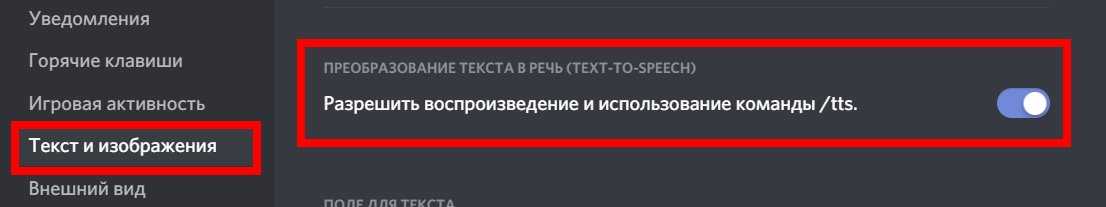 Выделяется еще один метод, как включить озвучивание сообщений с помощью TTS на Дискорде. Для этого снова зайдите в настройки, как и в прошлом случае, но перейдите в раздел Текст и изображения, а там в Text-to-Speech. Здесь имеется всего два варианта — поставить отметку или снять ее. В первом случае функция включается, а во втором отключается.