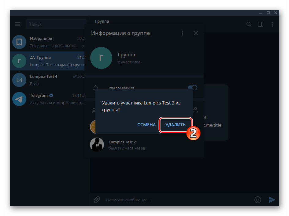 Наведите указатель мыши на имя второго пользователя группового чата, кликните по отобразившемуся в его области крестику,