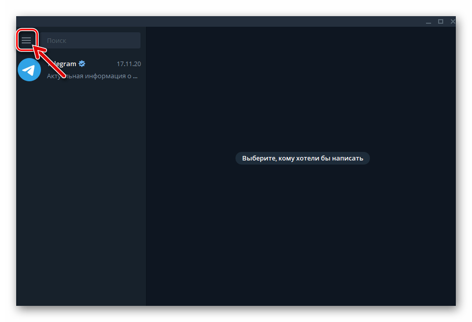 - Откройте Телеграм на компьютере и вызовите меню приложения, щёлкнув по трём чёрточкам в верхнем углу окна слева.
